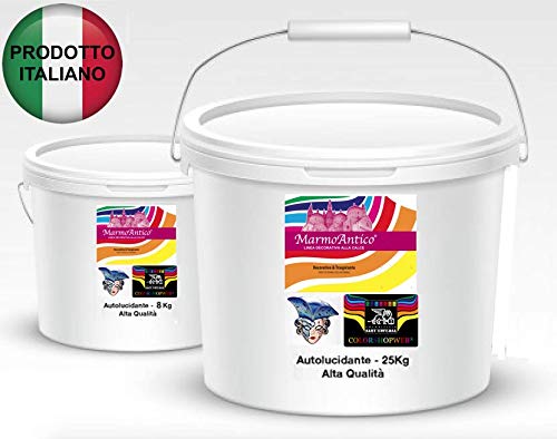 Hoogwaardige Venetië glanzende steen. Eigenschappen: het gaat om een natuurlijke minerale wandcoating op kalkbasis, voor hoogwaardige decoratieve oppervlakken binnenshuis. Het kan worden bewerkt, waarbij de nerf van de bodem wordt bedekt, waardoor het typische “geschoren kalk”-effect direct op goed verwerkte civiele pleisterwerk wordt bereikt of als afwerking voor marmeren in Lucido Marmoantiek kan worden gebruikt, wanneer een zeer glanzend en glad oppervlak met de typische tinten van traditionele marmorine moet worden bereikt. Moderne productietechnieken en speciale additieven van minerale en plantaardige oorsprong zorgen voor een hoge bewerkbaarheid, weerstand en duurzaamheid dan normaal kalkvet. De basisminerale samenstelling zorgt voor een optimaal ademend vermogen en bestendigheid tegen schimmel- en bacteriën. Toepassing: voor hoogwaardige oppervlakken binnenshuis op gipskartonplaten en reeds geschilderde pleister- en gipsplaatplaten, indien ze stevig, droog en schoon zijn. Gebruik: het gebruik gebeurt met roestvrijstalen plank op schone, droge en beproefde ondergronden. “geschoren kalk”-effect: voor het scheren op nieuw of ongelijkmatig pleisterwerk, glad en goed afgewerkt, probeer eerst het schuurpapier en de borstel van de ondergrond te verwijderen, zodat het te veel zandkorrels of niet consistent is. Breng daarom na het bevochtigen van de muur met een roestvrijstalen raspplank aan, altijd in zeer dunne diktes, afhankelijk van het effect en de dekking. Gemaakt voor een effect Sterk gestippeld, altijd weinig product aanbrengen. De laatste laag moet met gekruiste en goed verdeelde spatels worden aangebracht en vervolgens met roestvrijstalen plank permanent schoon en vochtig worden gepolijst.